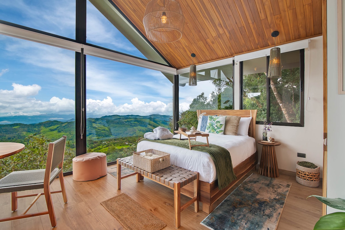 Escape to our secluded Glass Cabin 1.0, nestled in the forest, offering a mesmerizing 270° vista of the Pacific Ocean and cloud forest. Delight in a mountain-view bathtub and unwind in a king-size bed. - Just 10 min drive to downtown - Closer to main attractions Your private deck with a hot tub awaits, perfect for sunset-watching and stargazing with a glass of wine. Can’t find availability? please visit our new Glass Cabin, with the same view. https://www.airbnb.com/slink/OHzsorZO