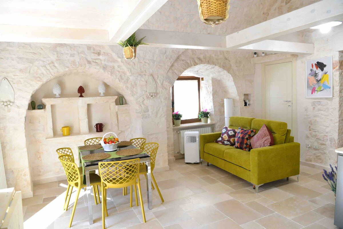 Decorado com estilo, respeitando as características dos trulli, a acomodação está equipada com ar-condicionado e aquecimento, com a possibilidade de usar a cozinha equipada com louça, geladeira, TV em todos os quartos, com gazebo externo onde você pode relaxar e desfrutar das belezas do lugar, sofá-cama com a possibilidade de adicionar uma quarta cama gratuita, mediante solicitação. Banheiro em pedra típica equipado com chuveiro, vaso sanitário, pia e acessórios: secador de cabelo, roupa de cama, banho e cama.