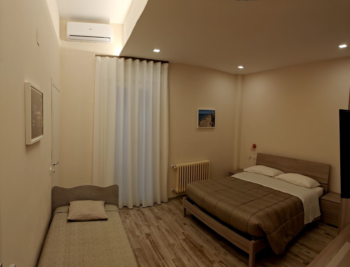 at the ‘B&B mare mio’ you stay in a splendid sea-view flat on the second and last floor of a 1950s building, with reserved car parking, just a few steps from the beach with a beach umbrella reserved for you, next to the ‘strada parco’ with its characteristic Wednesday street market, 1 km from the shopping promenade with various shops and the night ‘movida’ in the pedestrian precinct and, for our welcome guests only, conventions/immediate discounts at local activities.