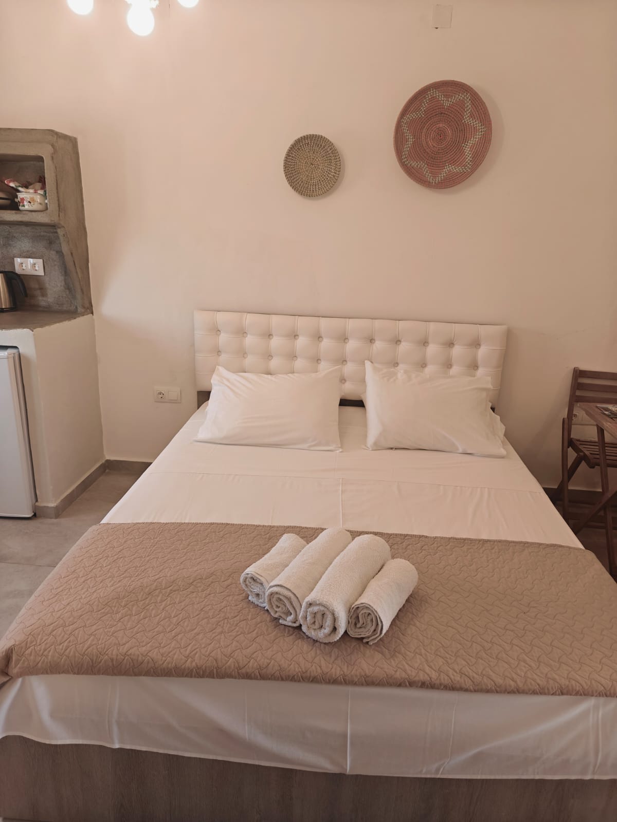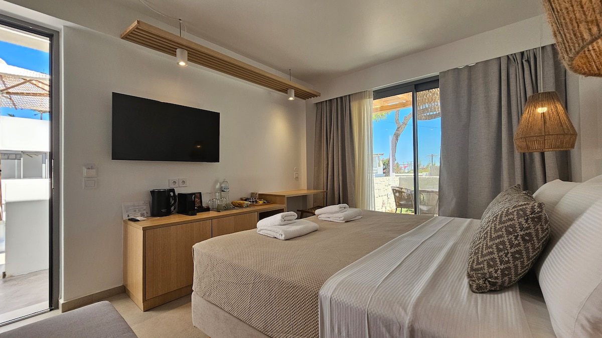 Semiramis Guesthouse Milos Only 130 meters from the city center our fully renovated, Junior Suite is a ground-floor 24 sq. meters Suite with modern facilities and is fully furnished with one double bed (European King Size 160x200cm) and one Single bed, television Netflix, a safe-box, air conditioning. Junior Suite will be able to accommodate also 3 guests with an extra cost 15% of the original price as Double. Breakfast is optional not included in the Room price, is 9 euro extra per person.