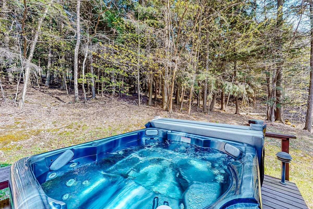 As janelas do chão ao pico desta estrutura em A atualizada de meados do século têm vista para o Mad River Valley. É uma caminhada fácil até a histórica Waitsfield Common Road, conhecida localmente como uma das melhores estradas para caminhadas/ciclismo do Vale, se não de Vermont. As estações de esqui ficam a 10 a 15 minutos de carro. Nos meses mais quentes, este é um ótimo ponto de partida para caminhadas, ciclismo, caiaque e pesca. Depois de um dia fora, relaxe na banheira de hidromassagem e aproveite o ar fresco.