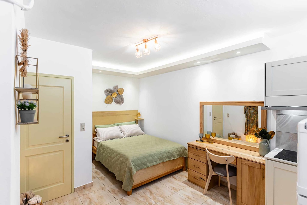 Desfrute de férias em nosso novo e charmoso estúdio com uma varanda com vista para nossa horta. Nosso edifício de estilo cicládico está localizado na estrada principal da movimentada Agia Anna, a uma curta distância a pé de muitos bares de praia, restaurantes e das praias mais populares de Naxos! Estamos localizados a 500 metros da praia de Agia Anna, a 11 minutos da cidade de Naxos (porto) de carro e a 6 minutos do aeroporto. O anfitrião ocupa um apartamento privado separado no edifício e está prontamente disponível para ajuda e sugestões