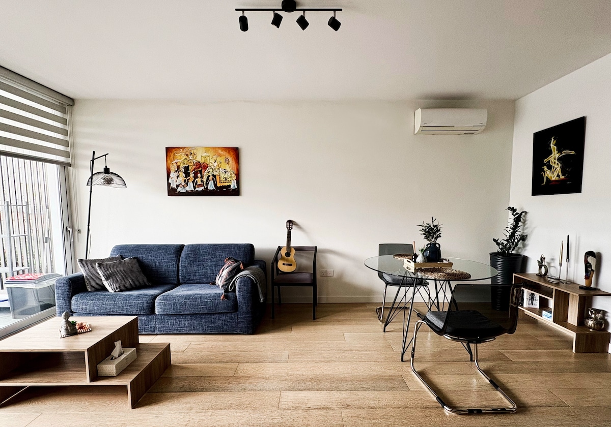 Este é um novo apartamento de dois quartos de 89 m ², situado em um complexo exclusivo chamado Interlace, composto por apenas nove apartamentos e localizado em uma área residencial serena, mas muito perto do centro da cidade. O apartamento fica no terceiro andar com uma excelente vista para a cidade. Imaculadamente vestidos, os interiores são um equilíbrio atraente de moderno e retrô, onde uma paleta de cores terrosas é impulsionada por móveis de alta qualidade de marca.