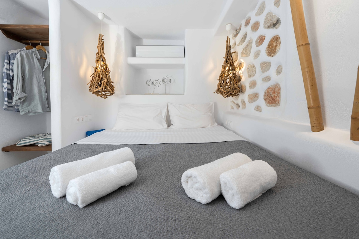 Bright, modern studio penthouse in a classic Greek island neighborhood in Naxos, just 100m from Saint George beach. Perfect for couples or friends, this serene retreat features two large, private rooftop patios for soaking up the sun. Enjoy a comfortable stay with high-end amenities and easy access to the vibrant town center. Sleeps 2 comfortably.