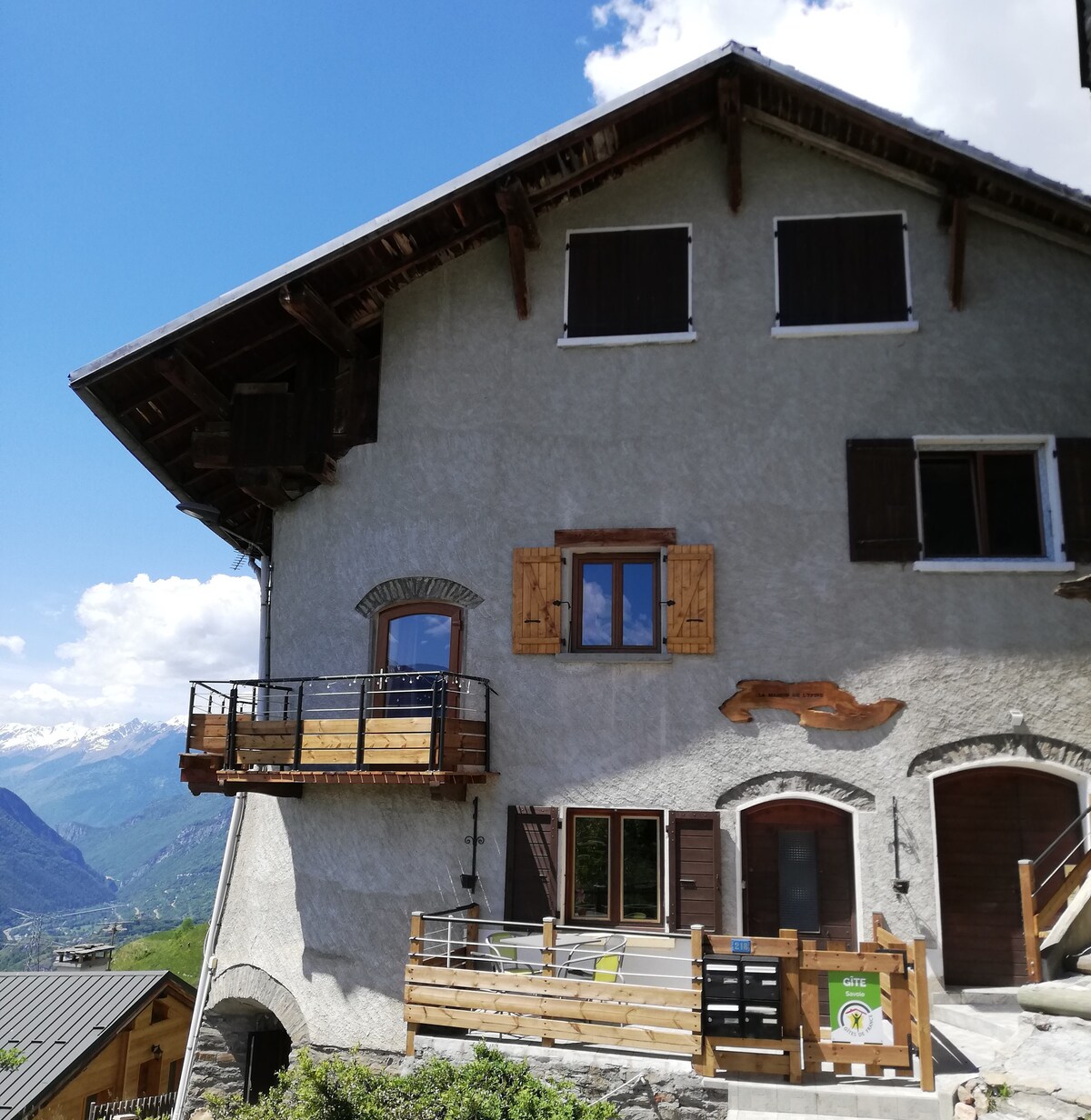 apartamento de 50 m² para 2 a 5 pessoas. 1 sala de estar com geladeira, fogão a gás, micro-ondas, cafeteira, TV, Wi-Fi. 1 quarto fechado com 1 cama de casal para 2 pessoas. 1 quarto fechado por uma cortina com 1 cama para 2 pessoas. 1 mezanino com 1 cama para 2 pessoas. A acomodação está localizada em nossa casa no 2º andar, acesso independente por uma escada externa, varanda com vista para as montanhas. Vila tranquila na encosta do sol. A 2 km de Aime e suas lojas. Animais não são permitidos. Sem transporte.
