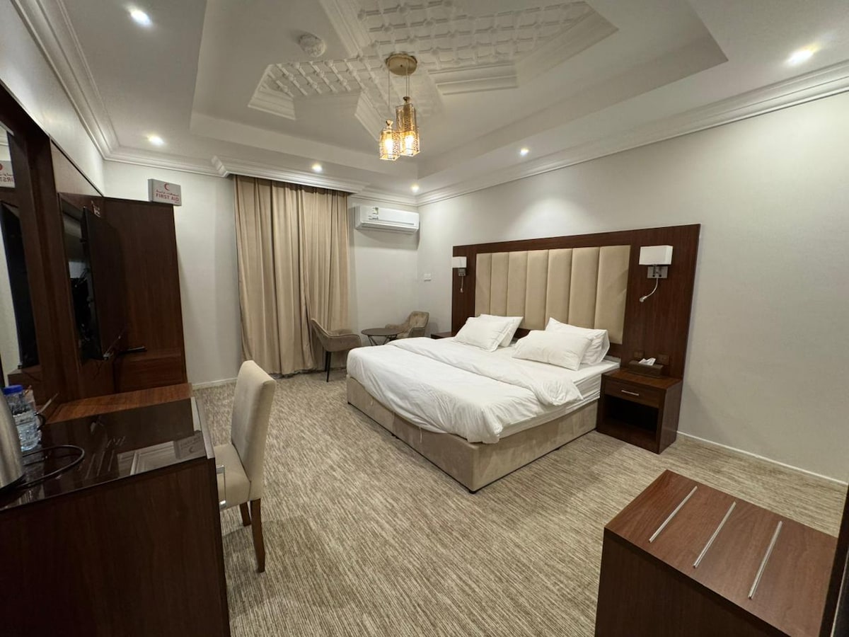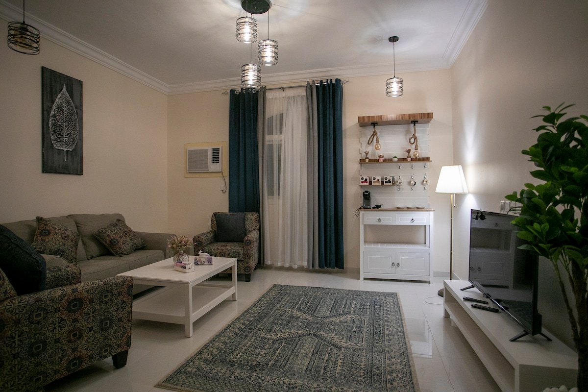 Um apartamento com serviço completo e totalmente mobiliado com dois quartos, uma sala de estar e uma cozinha completa! Oferecemos limpeza gratuita, Wi-Fi, TV, entrega de mantimentos e muito mais. Sinta-se em casa enquanto estiver em Al-Ula.