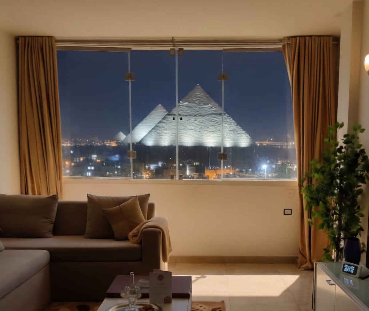 Acorde com vistas deslumbrantes das Grandes Pirâmides e campos de golfe exuberantes do seu apartamento privado de 2 quartos. Moderno, iluminado e totalmente equipado, é ideal para casais, famílias ou amigos. Desfrute de uma espaçosa sala de estar, quartos aconchegantes, varanda com vista para o nascer do sol e uma cozinha para refeições caseiras. A poucos minutos das pirâmides e dos cafés locais, esta estadia combina conforto, história e relaxamento em uma experiência inesquecível.