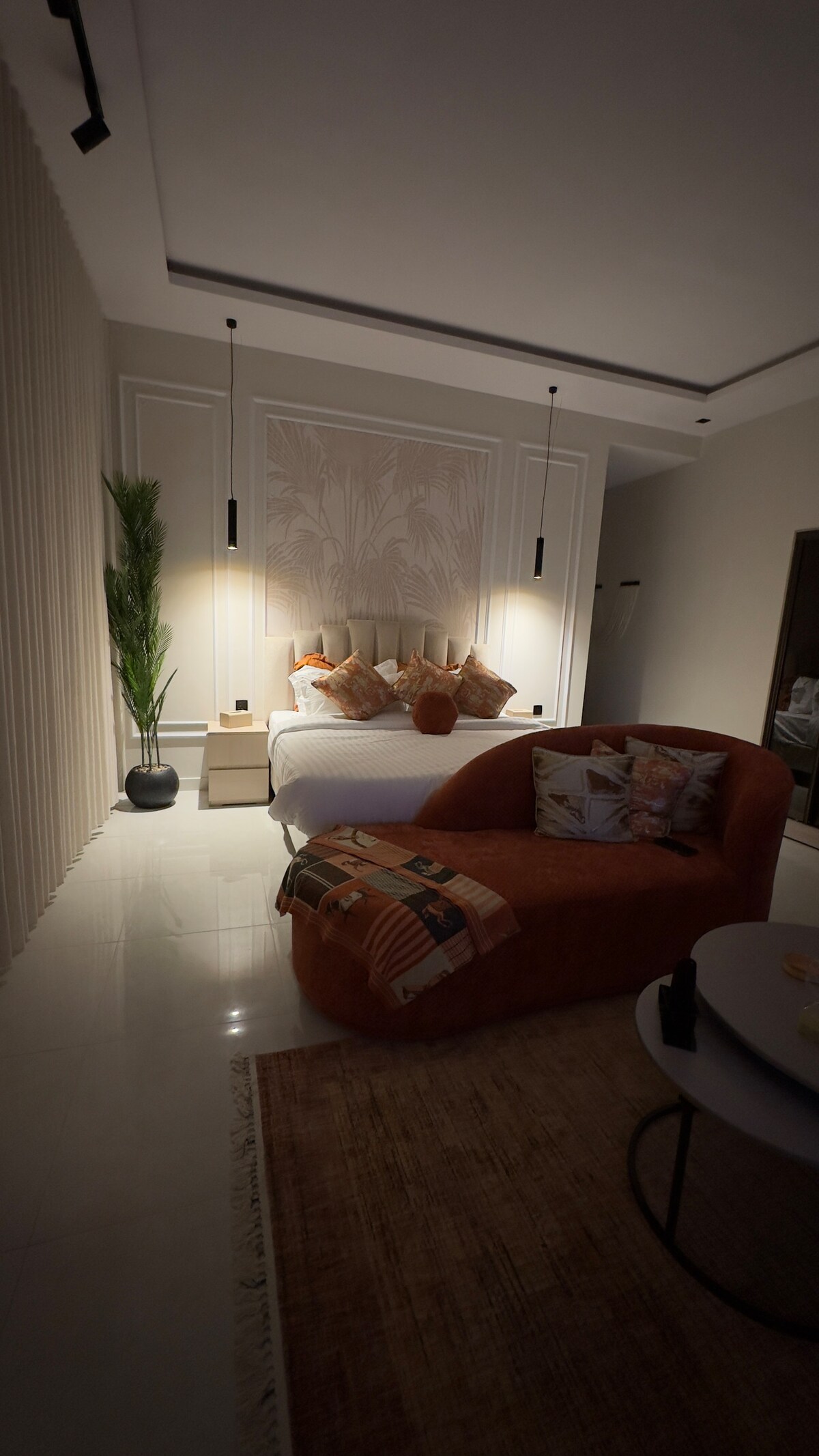 This unique place has a style all its own.A stylish and modern apartment with a unified design between the living room and bedroom. The space features cozy furniture and elegant decor that creates a relaxing atmosphere. Equipped with a 65-inch Smart TV with access to all major streaming platforms, and high-speed fiber internet. Enjoy a Nespresso coffee machine, electric kettle, and a compact kitchen with a stovetop and toaster for your daily needs. A perfect stay for both work and relaxation.