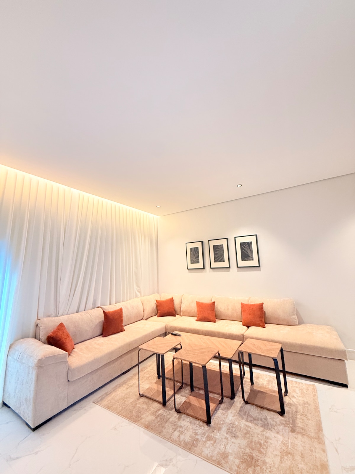 شقه بتصميم حديث غرفة نوم وصــالــة تحتوى على غرفه نوم بسرير ماستر بمفرش فندقي وصاله مساحه واسعه بتلفزيون ذكي 60 بوصه بدعم اشتراك نت فلكس ومجهز ثلاجه وايضاً يوجد بار قهوة وشاهي وغلايه وادوات الشاي ودورة مياة مجهزة بالكامل بالاضافة الي وجود انترنت مجاني عالي السرعه وتمتاز الشقه بالخصوصية العالية بدخول ذاتي كما يوجود مصعد كهربائي و مواقف خاصه تقع في حي الريان