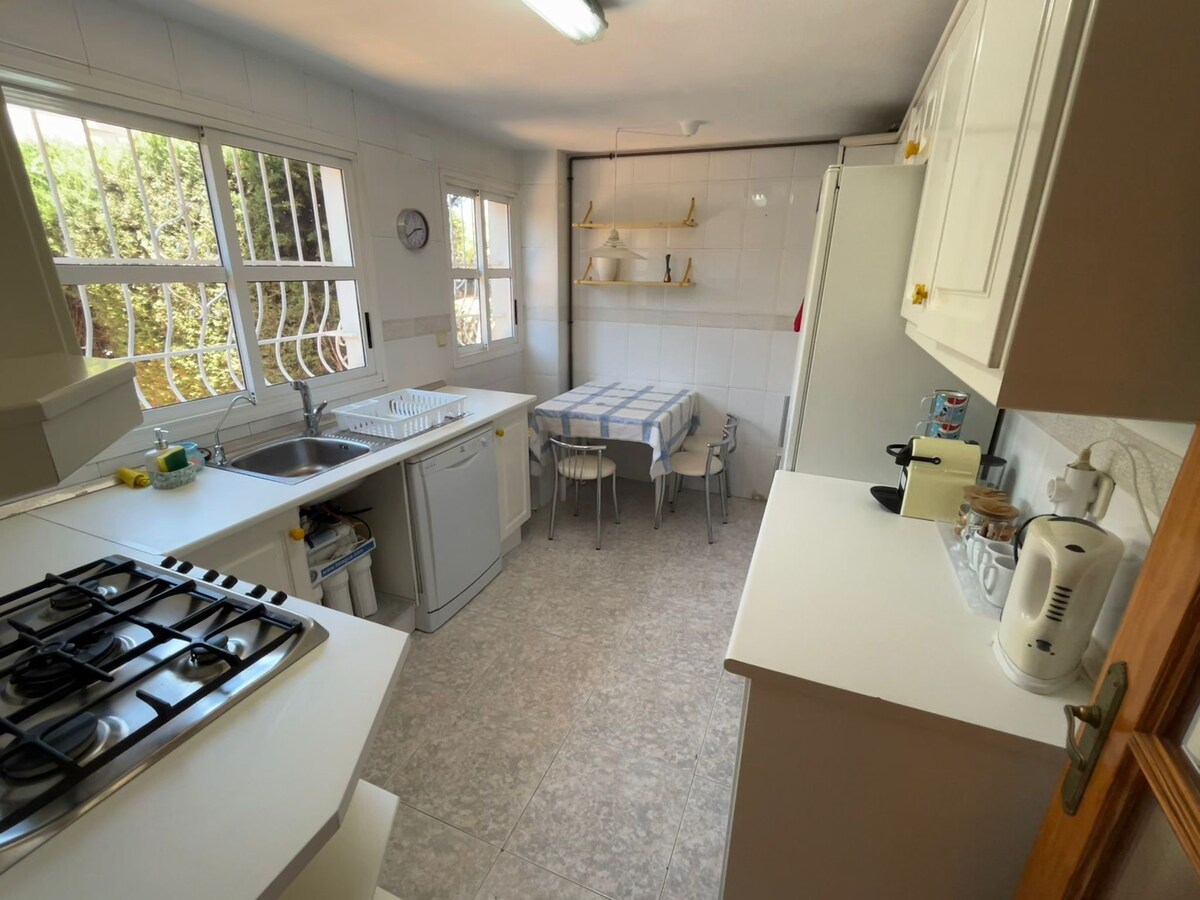 Relaxamento à beira-mar🌴em um jardim tropical Casa de dois andares, cozinha totalmente equipada, terraço para churrasco, ar-condicionado frio/quente em todos os quartos, colchões de espuma, estacionamento gratuito 3 campos esportivos gratuitos, restaurantes e pubs gratuitos de 3 e 1 allyear (NÃO aquecidos) em 200m. Do outro lado da rua: reserva natural 360ha. 300 m a pé até uma praia de bandeira azul de 3 km. Ônibus para Alicante, Santa Pola, Elche, ALC Airp. Opção de café da manhã no café nas proximidades por um preço com desconto. Caminhadas, ciclismo e viagens de um dia encantadoras Wi-Fi:5g-600mbs