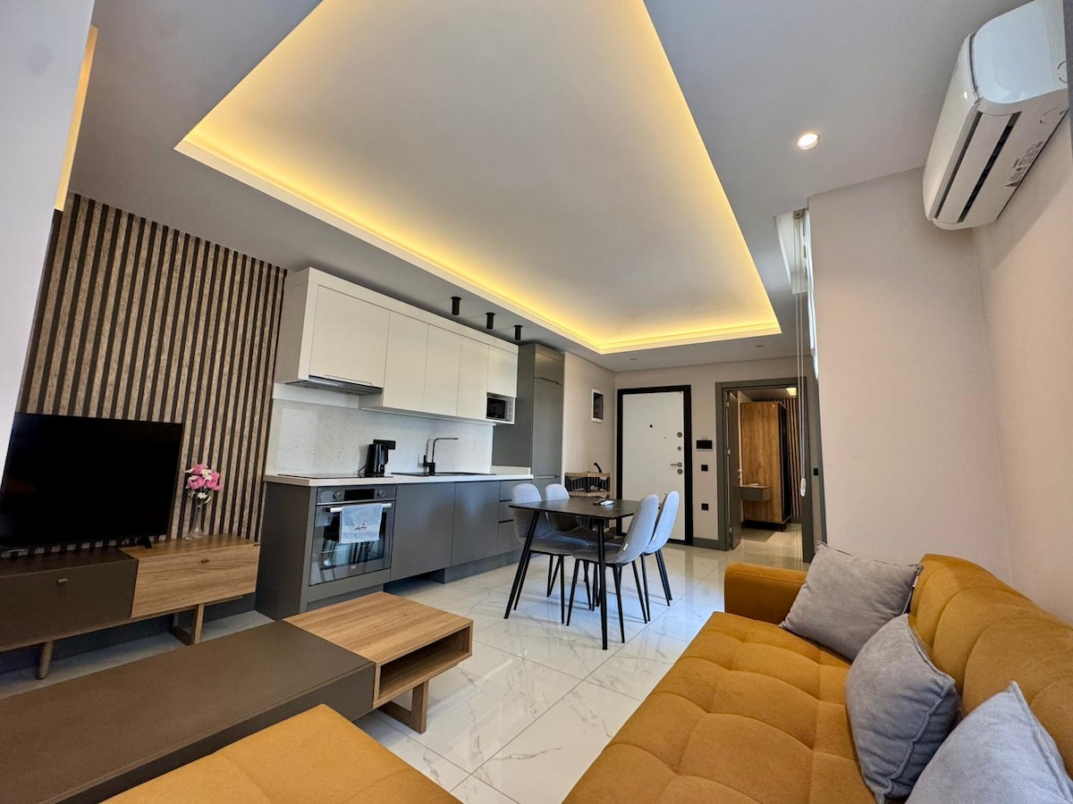 Um aconchegante apartamento de designer no coração de Alanya – desfrute de luxo na costa mediterrânea! A residência premium tem uma infraestrutura hoteleira de 5* e está localizada a 100 metros de sua própria praia com um café aconchegante, onde você pode desfrutar de seu café da manhã, coquetéis refrescantes e lanches leves. O apartamento fica no centro de Alanya, perto dos melhores restaurantes, clubes de praia, lojas e principais atrações. Todos os principais locais estão a uma curta distância a pé!