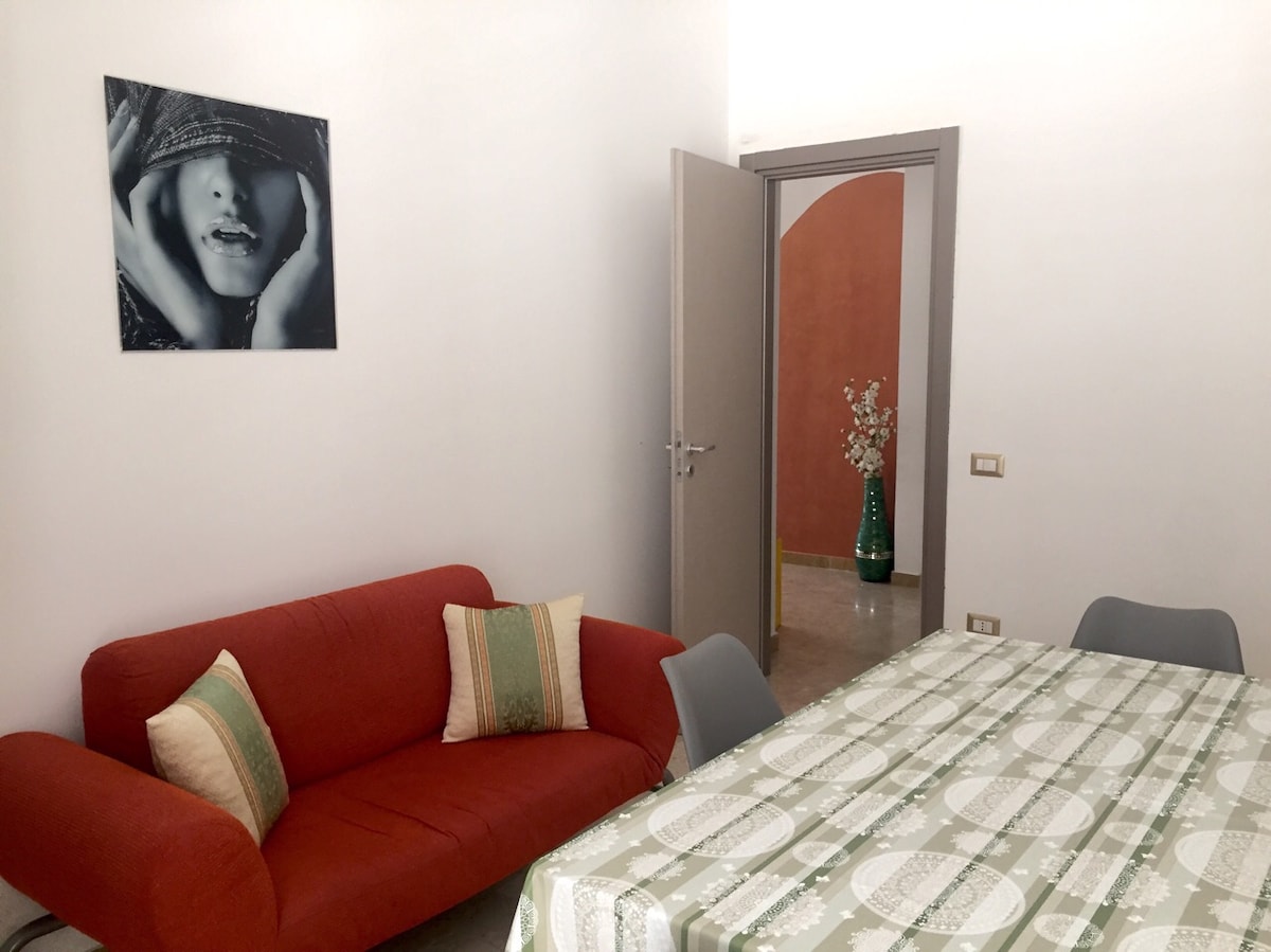 Elegante appartamento, di recente ristrutturazione, arredato con gusto e in maniera funzionale per viaggiatori da tutto il mondo. Ampia sala da pranzo,TV, wi-fi, ventilatore da sofitto, angolo cottura, divano, microonde, bagno con doccia, vano lavatrice, camera da letto con TV condizionatore Spazio esterno con Pergolato attrezzato, possibilità di accesso al terrazzo illuminato con angolo frigo, tavolino e sedie. Nelle vicinanze sono presenti supermercati, ristoranti, farmacia, parrucchieri ecc.