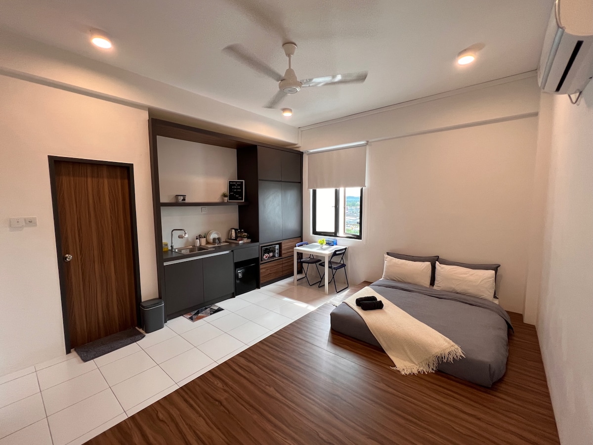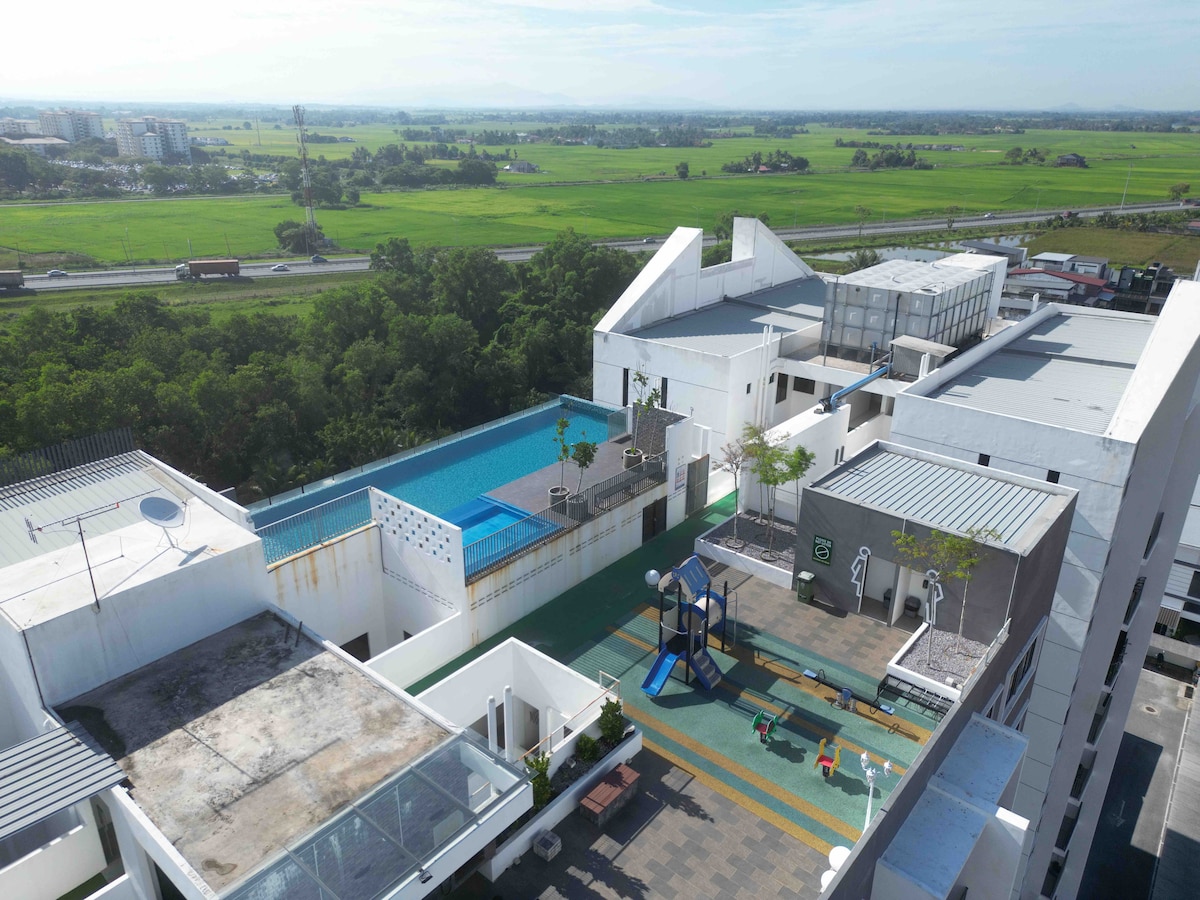 Traga toda a família para esta unidade aconchegante,compacta, confortável, conveniente e completa para você ter uma estadia divertida. Vista panorâmica do olho de pássaro da cidade de Alor Setar, com vista para o deslumbrante pôr do sol diretamente da varanda, pois nossa unidade está localizada no nível mais alto! Piscina temporariamente fechada até 18 de dezembro de 2025 Uma unidade familiar com utensílios de cozinha completos, máquina de lavar roupa de carga frontal e conjunto de churrasqueira/barco a vapor interno. Localizado dentro da área de entrega de alimentos e cobertura de táxi.