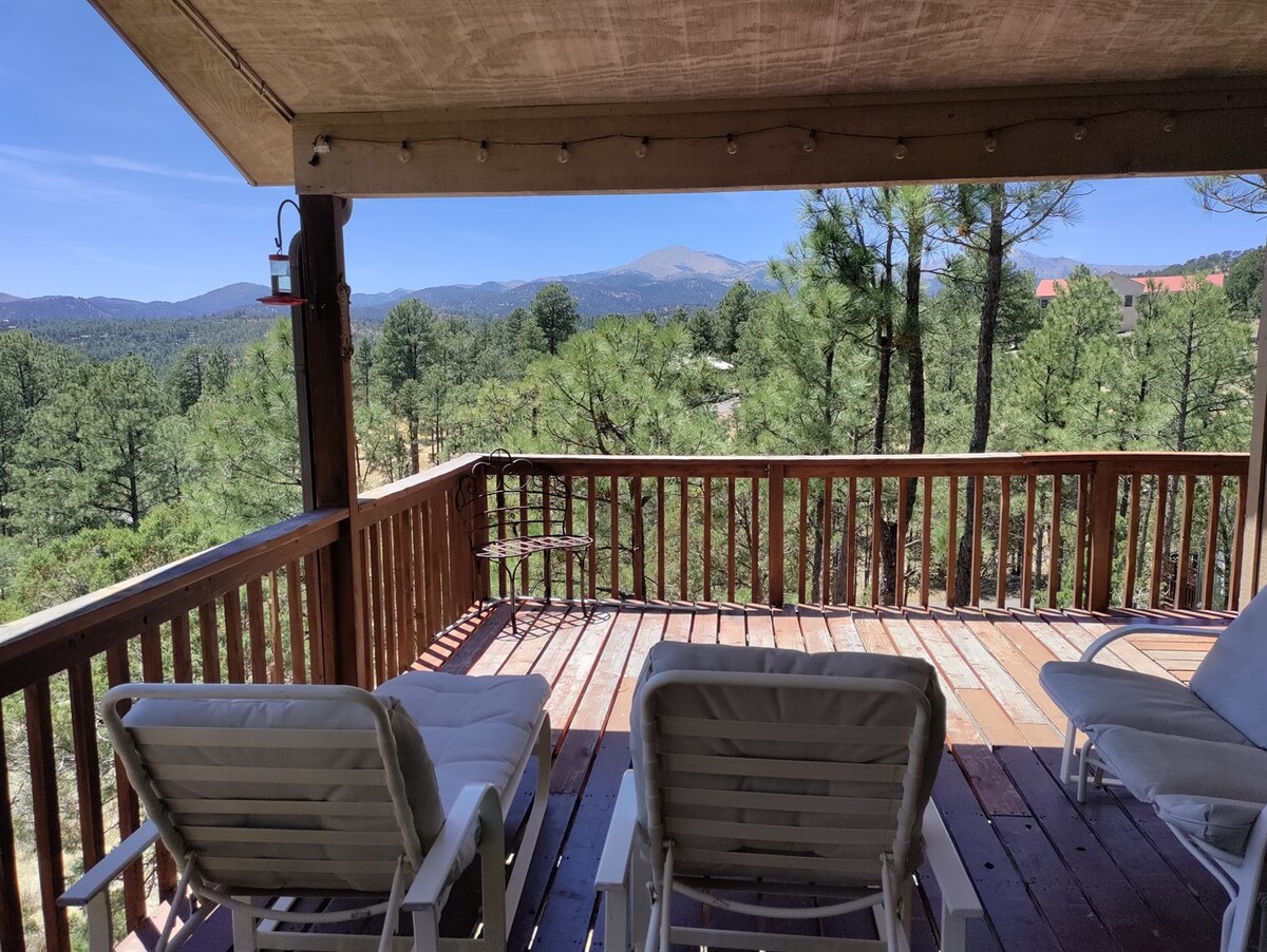 Belo chalé de 2 andares, 2 camas e 2 banheiros tem uma vista desobstruída INCRÍVEL da Montanha Sierra Blanca e fica situado no alto entre os pinheiros em um bairro atraente. Dois quartos queen size, cozinha completa, bela lareira vermelha eficiente, aquecimento e resfriamento, grandes janelas da área de estar de frente para as montanhas. Wi-Fi, TV com leitor de DVD e Roku no andar de cima e Roku TV menor no andar de baixo. **Desde o incêndio de junho de 2024, a cabana está intacta - consulte a foto adicionada atualizada intitulada "Nova vista da paisagem após junho de 2024"**