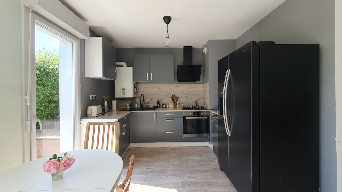 Desfrute de uma casa elegante e central. Linda pequena vila afastada da estrada principal e a poucos minutos a pé do centro de Caen. - Terraço Brasero - Aquecimento reversível com ar-condicionado - Fornecimento de todas as roupas de cama (lençóis, toalhas, toalhas de prato...) - Presentes de boas-vindas: sabonete, xampu, cápsulas de café... - Limpeza de checkout