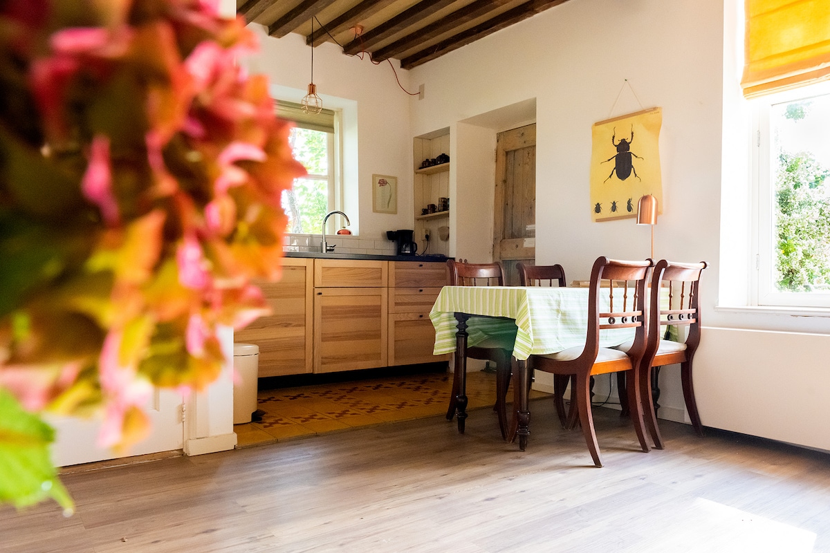 A casa foi reformada em 2017. É um edifício de um andar, semi-separado, situado ao lado da casa dos proprietários. Tem uma entrada separada. A casa tem uma sala de estar com cozinha aberta, acesso a um terraço com uma vista esplêndida do campo e um banheiro bem equipado com chuveiro de efeito chuva, um quarto duplo com uma cama de casal separável (160 cm) e um quarto pequeno para 1 pessoa com uma cama de solteiro. A casa é adequada para 3 pessoas. Há uma cama extra no sofá na sala.