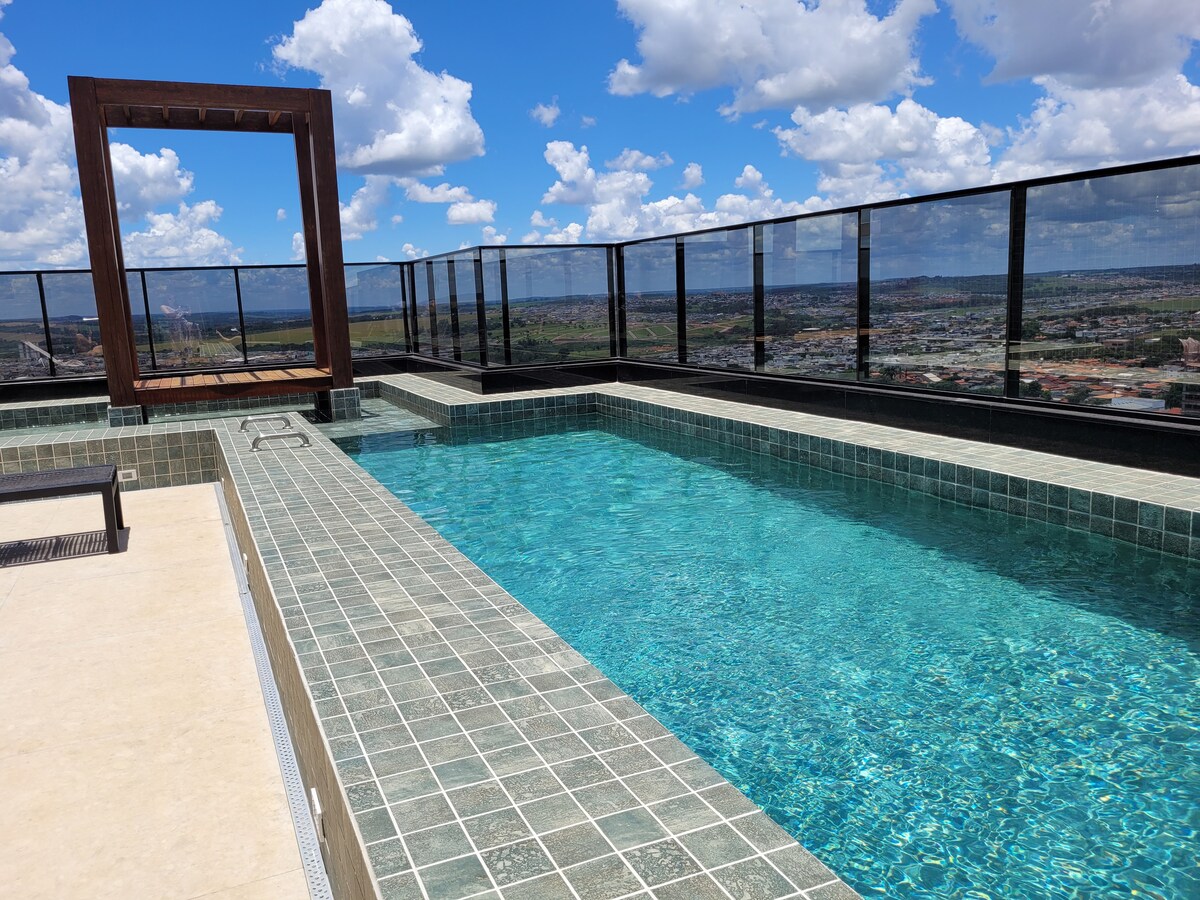 Apartamento novo de 1/4 no Gran Life Medical Complex, no centro de Anápolis, GO. Acomoda até 3 hóspedes. Tem 1 suíte com cama de casal, ar condicionado e guarda-roupa. Sala com sofá-cama, cozinha completa (microondas, forno elétrico, filtro, geladeira, fogão, liquidificador, cafeteira elétrica), banheiro social e espaço de trabalho. Condomínio com piscina, academia, área infantil e vaga de garagem. Vista linda e localização privilegiada, perto de tudo. Conforto e praticidade em um só lugar !