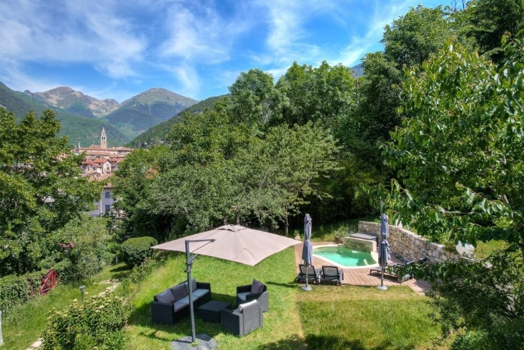 Tipo suíte parental com pedras expostas, banheiro privativo moderno, acesso independente por um terraço com vista panorâmica deslumbrante da cidade velha/mar/montanhas/piscina e jardim com vista para uma pequena sala de estar que permite duas camas adicionais para crianças. Ideal para um casal. Acesso à piscina privada. Vila encantadora com um coração garantido, localizada no centro de Menton, acessível por um acesso a pé de cerca de 100 m. no campo no meio da cidade. A 5 minutos a pé do mar, estação de trem, perto de lojas e do centro da cidade.