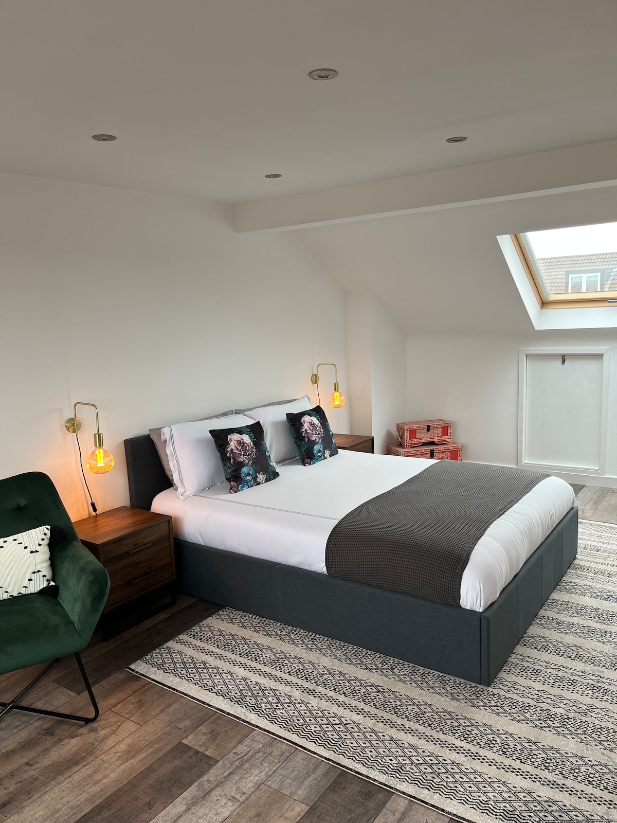 Preço com base em 1 grande quarto king size e 1 quarto duplo com banheiro privativo para até 4 pessoas. Chaleira, torradeira, frigobar e itens básicos de café da manhã fornecidos. Toalhas também fornecidas. Os 2 quartos e casa de banho estão no último andar da nossa casa e oferecem total privacidade para a sua estadia. A porta da frente é de acesso compartilhado, mas você terá uma chave para que você possa ir e vir como quiser. Não há festas de despedida de solteiro. Carregador de veículos elétricos disponível com carro para estacionar.