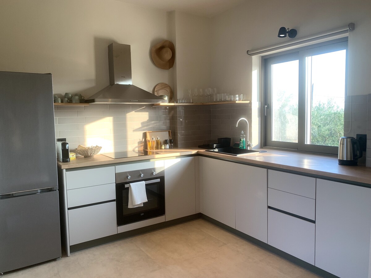 Situada entre oliveiras, nossa moderna vila de pedra fica a apenas 5 minutos de carro da pitoresca vila de Agios Nikolaos e a 300 metros da praia. Com 5 quartos (2 com banheiros privativos), 4 banheiros e WC, acomoda confortavelmente famílias. Todos os quartos possuem varandas, enquanto a cozinha totalmente equipada e a espaçosa mesa de jantar para 10 pessoas. Desfrute de opções de aquecimento e resfriamento, uma grande área de estacionamento e uma mistura de design moderno e tradicional convidativa. Seu retiro perfeito está à sua espera!