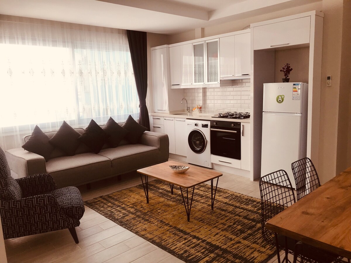 Private 3th floor modern/mediterranean designed cosy 1+1 apartment with balcony. There is an elevator in the building. There is a security 7/24 just across the street. Beautiful watercourse 'Boğaçayı' is just around the corner. Sushi Restaurant in front of the building. You can be on the beach just in 2 min walking. You can find many restaurants when you walk on the seaside. Diverse restaurants and breakfast/lunch/dinner cafes within minutes walk. . The best our city center has to offer!