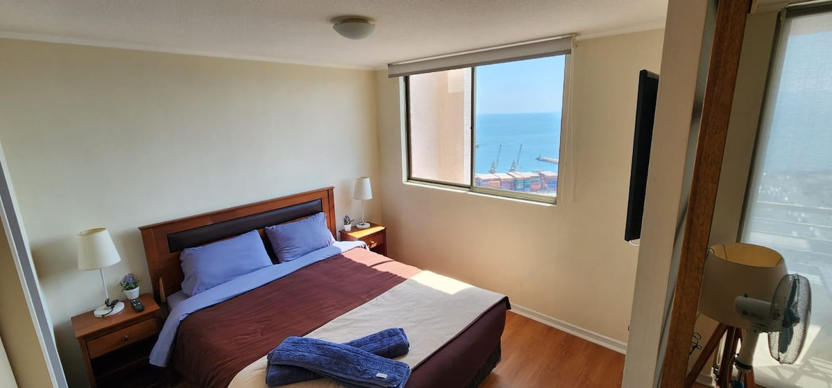 Belo apartamento que tem 1 quarto em suíte e tv en dormittorio, muito aconchegante lindamente decorado e totalmente equipado para uma estadia agradável, com uma vista insuperável do mar, localizado no centro da cidade com locomoção de conectividade muito boa na porta, supermercado nas proximidades, shopping center, com estacionamento privado