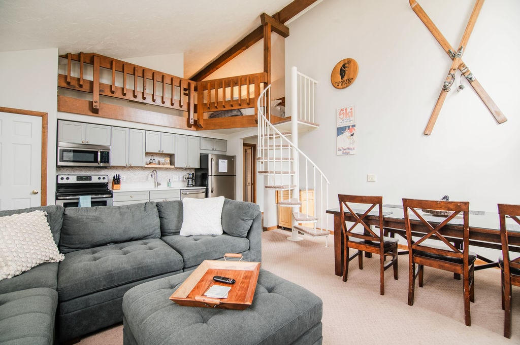Esta unidade está localizada diretamente acima de um MOVIMENTADO BAR NOTURNO aberto até as 2h. O bar tem uma fogueira ao ar livre. Máquina de ruído branco e tampões de ouvido são fornecidos. O Loft coloca você diretamente no coração do Shanty Creek Resort. Desça as escadas para o movimentado Shanty Bar para obter todas as suas necessidades de provisão/curta caminhada até o Starbucks Coffee Bar no Lakeview Hotel. Não quer dirigir? Pegue o traslado de cortesia com acesso ao centro de Bellaire, Cedar River e Schuss Mountain