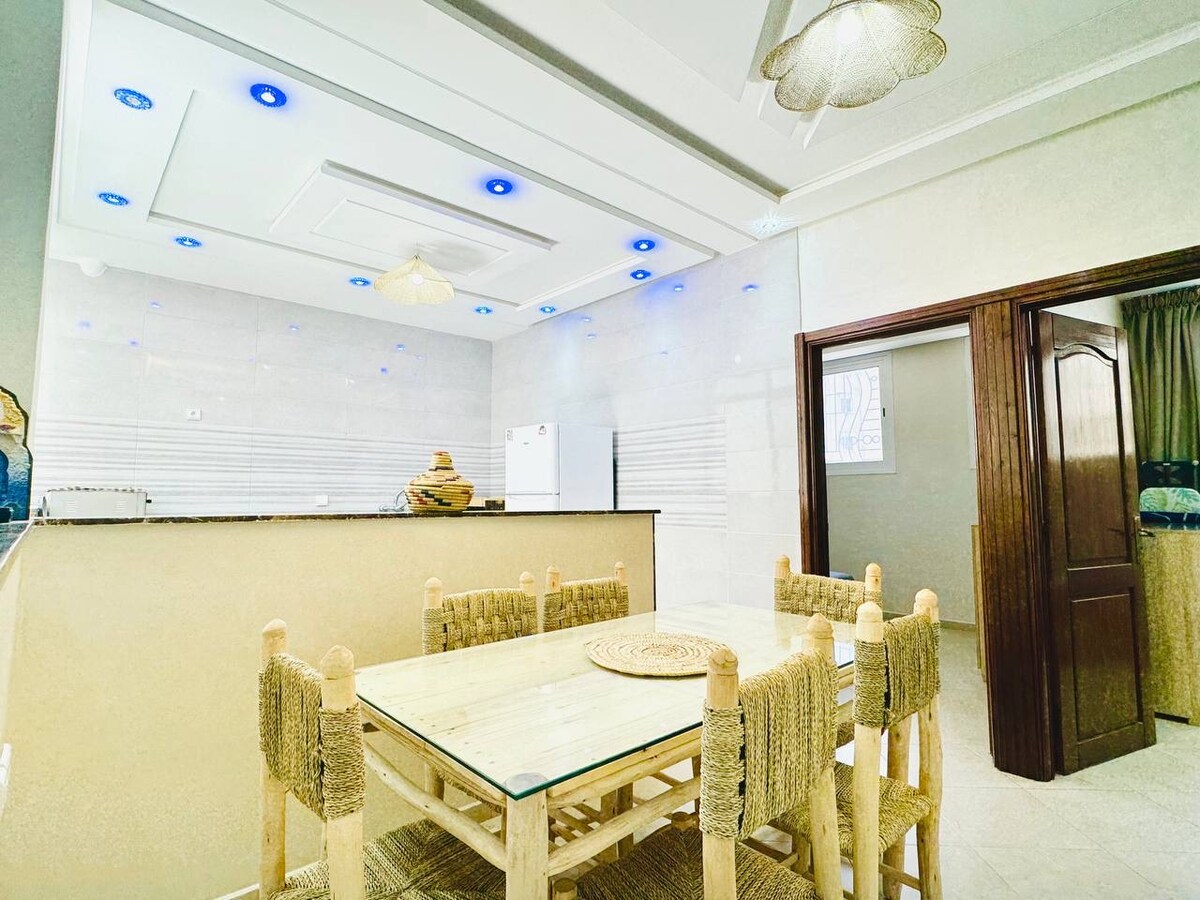 Create unforgettable memories in this warm and welcoming home ✨🏡 Just 10 minutes from the beach and Adrar Stadium, in a calm and secure area 🌿 Enjoy 2 cozy bedrooms 🛏️, a bright living space 🛋️, and a beautiful terrace 🌞 perfect for relaxing or dining. Ideal for families and friends 🤍 Mint tea 🍵 is offered throughout your stay on demand, and an in-house chef 👩🍳 is available for delicious homemade meals.
