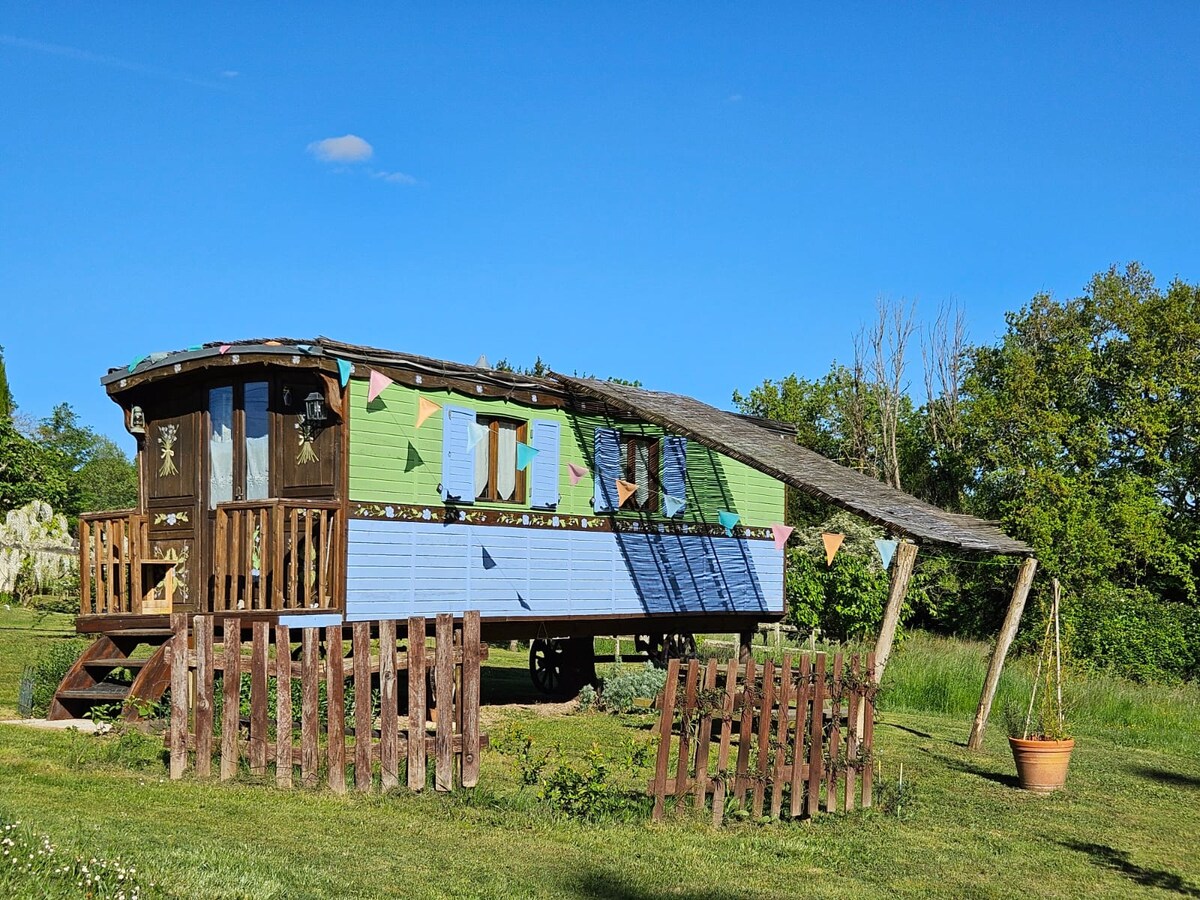 Reconecte-se com a natureza nesta escapada inesquecível. Venha e fique em nossa cabana de pastores sob medida (Roulotte em francês) e desfrute da paz e tranquilidade da bela zona rural. Tem todas as instalações que você precisa para desestressar, incluindo ar condicionado completo!Um spa para se refrescar ou aquecer e uma área de deck para se sentar e passar as noites com uma boa taça de vinho e uma cozinha adorável! Perto de cidades de Bastide para mercados diurnos e noturnos, restaurantes e passeios encantadores.