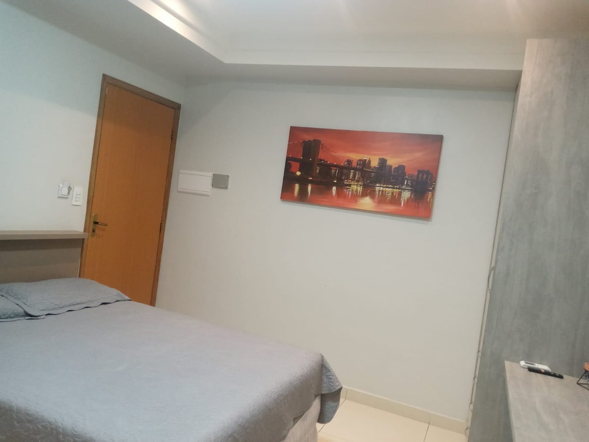 Prédio novo que fica próximo a cartão postal da cidade de Goiânia, o Parque Vaca Brava. A melhor área de lazer de Goiânia. Por perto, há outras comodidades, como Goiânia Shopping, supermercado Bretas, padarias e restaurantes. O apartamento é um studio bastante aconchegante, com ar condicionado de 18 mil btus para aguentar o calor de Goiânia. Fica no 8 (oitavo) andar. No Apto, há uma cama de casal e um sofá-cama 2 lugares para bem acomodar o hóspede. Há garagem, no subsolo.