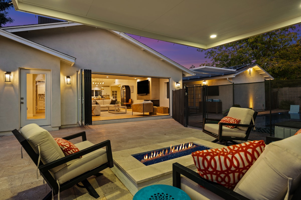 Bem-vindo à sua vila privada, a 8 minutos da Cidade Velha de Scottsdale, o refúgio perfeito. Acomoda 16 amigos e familiares na piscina aquecida*, spa e lareira. Cozinhe fora na cozinha da cabana, músicas no som surround, jogue xadrez em tamanho real, jante, vinho ou relaxe nas espreguiçadeiras. Deslize a parede de vidro para dentro/fora vivendo no seu melhor. 4 quartos, 3,5 banheiros e um amplo layout aberto com tetos altos em luxo moderno. Profissionalmente projetado pela Style Me GHD.