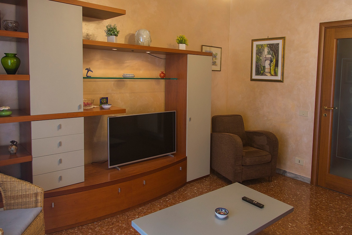 Bem-vindo à "Casa Verde das Memórias"! Este apartamento, parte de um edifício de três apartamentos de propriedade da minha família, é ideal para casais que querem explorar a cidade, residindo no centro histórico. Localizado no segundo andar, oferece cozinha, banheiro e um quarto espaçoso com uma cadeira suspensa divertida. No piso térreo e no primeiro andar, gerenciado pelo meu irmão, há a casa de memórias Bianca e Rosa. O terraço compartilhado é perfeito para curtir o belo pôr do sol.