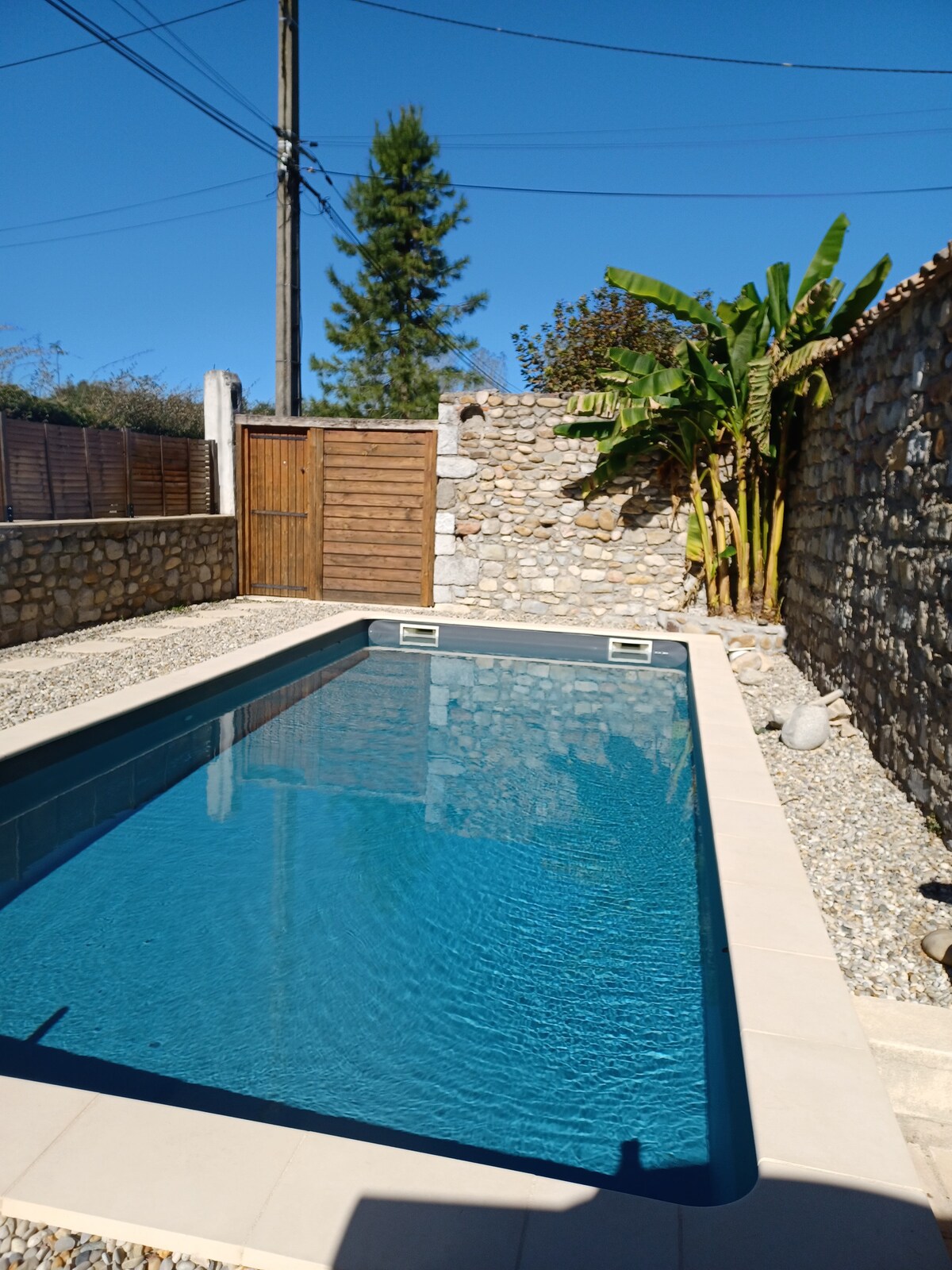Esta antiga magnanerie tem totalmente restaurado com bom gosto, vibe e personalidade combinando estilo contemporâneo e antigo (passarela em vidro, pedras expostas...). Grande terraço virado a sudoeste. Sala de estar com área de cozinha e área de estar, chuveiro com chuveiro italiano, vaso sanitário. A área de relaxamento interior (piscina e sauna a 28°C) será privada 24 horas por dia, 7 dias por semana. Ar condicionado reversível e fogão a lenha. Estação de carregamento de veículos elétricos, se necessário. Check-in e checkout de férias escolares no sábado