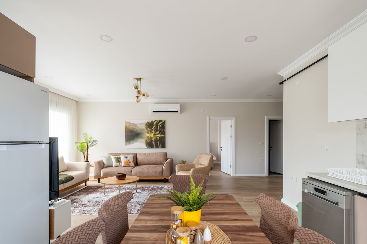 Stay in our stylish and spacious 3-bedroom, 3-bathroom ground-floor apartment near Izmit. With a large private patio, 55-inch Smart TV, free WiFi, and a fully equipped laundry room, every detail is stylishly designed for your comfort. The beautiful district of Kocaeli offers peaceful retreats with parks, trails, and scenic views. We are conveniently located: 1.5 hours from Istanbul Airport 1 hour from Sabiha Gökçen Airport 15 minutes from downtown Izmit 30 minutes from Sapanca