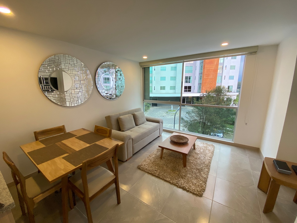 Apartamento acolhedor de 2 quartos e 2 banheiros completos no coração da cidade, a poucos passos de lojas, restaurantes, clínicas e transporte. Desfrute de uma cozinha totalmente equipada, sala de estar aconchegante com Wi-Fi rápido, cabo e dois quartos confortáveis para uma estadia tranquila. Relaxe na piscina, mergulhe na jacuzzi ou aprecie a vista deslumbrante da montanha enquanto bebe café local. Perfeito para famílias, casais ou viajantes individuais. Estacionamento gratuito, segurança 24 horas por dia, 7 dias por semana, para sua paz e itens essenciais para uma estadia sem estresse.