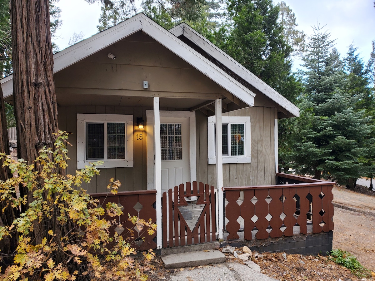 ~ Cabana rústica de 750 pés quadrados. Aceita cães, totalmente cercado, bela iluminação por toda parte. 8 min para o Lago Arrowhead e Lago Gregory ~ Participar de um casamento no Pine Rose? Estamos ao lado! ~ A uma curta distância de um pequeno mercado e do melhor restaurante da montanha (The Antler Grill) ~ Lareira a lenha romântica. Aquecimento central e A/C, TV de 65", cabo e internet ~ Churrasqueira a gás no quintal, jacuzzi para 3 pessoas (2 assentos, 1 lounge) rede, arremesso de ferradura e chuveiro ao ar livre (interno também) ~ Estacionamento fácil