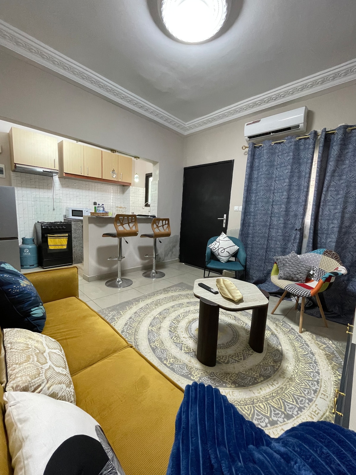 Bienvenue à Résidence HAYMES, Un appartement alliant élégance contemporaine, accents africains et haut de gamme. Niché au cœur du quartier calme de Mockeyville, ce cocon d’une chambre vous offre l’intimité d’un chez-soi, et le raffinement d’un lieu pensé pour se ressourcer. Style & Ambiance Décoration afro-minimaliste, lignes épurées, matières naturelles, objets d’art et mobilier recherchés pour profiter des chaleureuses journées, et des douces soirées bassamoises...