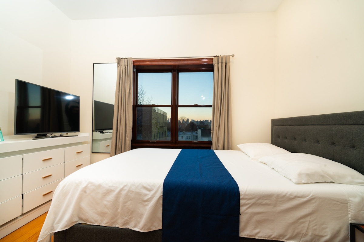 Relaxe neste quarto privativo calmo e cheio de estilo. O quarto tem uma cama tamanho queen, TV, espaço no armário e vista para Nova York da sua janela. Ele também dispõe de ar condicionado/aquecimento controlado remotamente e compartilha um banheiro no corredor. Você estará perto de tudo ao ficar neste lugar bem-localizado. Desfrute dos muitos parques locais para ir, como o Parque de Esculturas de Sócrates e a Ilha Roosevelt. Perto de trens e ônibus. Estou sempre disponível, pois moro na unidade.