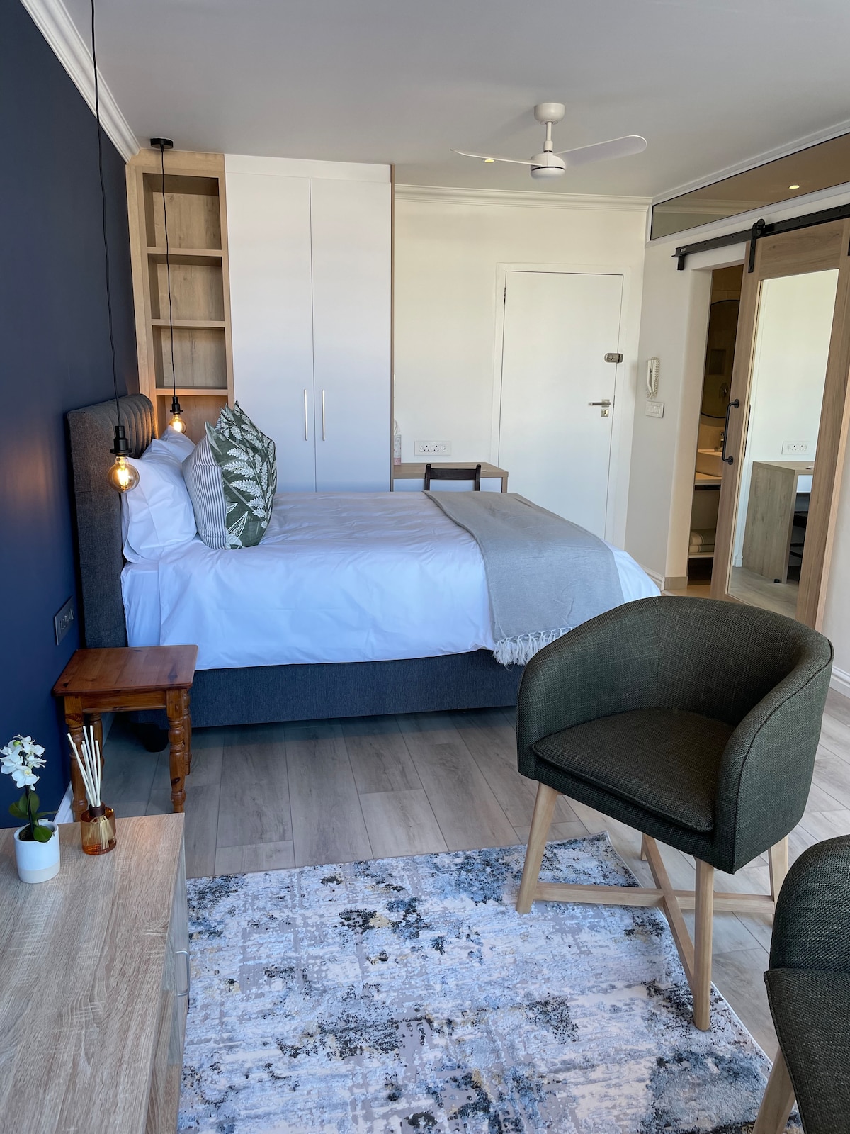 Nosso apartamento estúdio se abre para uma varanda de 40 metros quadrados com vista panorâmica para o Vale Hout Bay e as montanhas Helderberg além. Grandes portas deslizantes desaparecem nas paredes, criando um fluxo interno/externo desimpedido, enquanto a posição elevada protege sua privacidade. O banheiro em plano aberto está voltado para um jardim secreto fechado que inclui um chuveiro de vidro sem moldura. A unidade tem uma cozinha totalmente equipada e é atendida diariamente, exceto fins de semana e feriados.