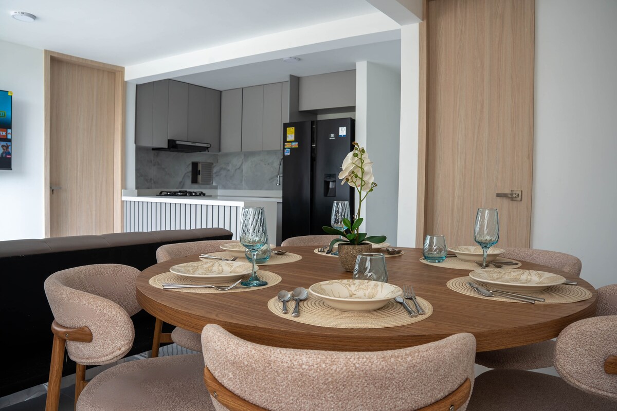 Apartamento confortável e bonito com 2 quartos, cada um com closet, banheiro privativo e AA. Quarto principal com cama de casal ninho (outra cama de casal embaixo) e o quarto secundário com 2 camas de solteiro ninho (outras 2 camas de solteiro embaixo). Cozinha totalmente equipada. Sala e estúdio com AA. Wi-Fi de alta velocidade e sinal de cabo. 3 Smart TV. Edifício com piscina e academia. Lembre-se de que você deve enviar sua documentação antes do check-in (leis colombianas).