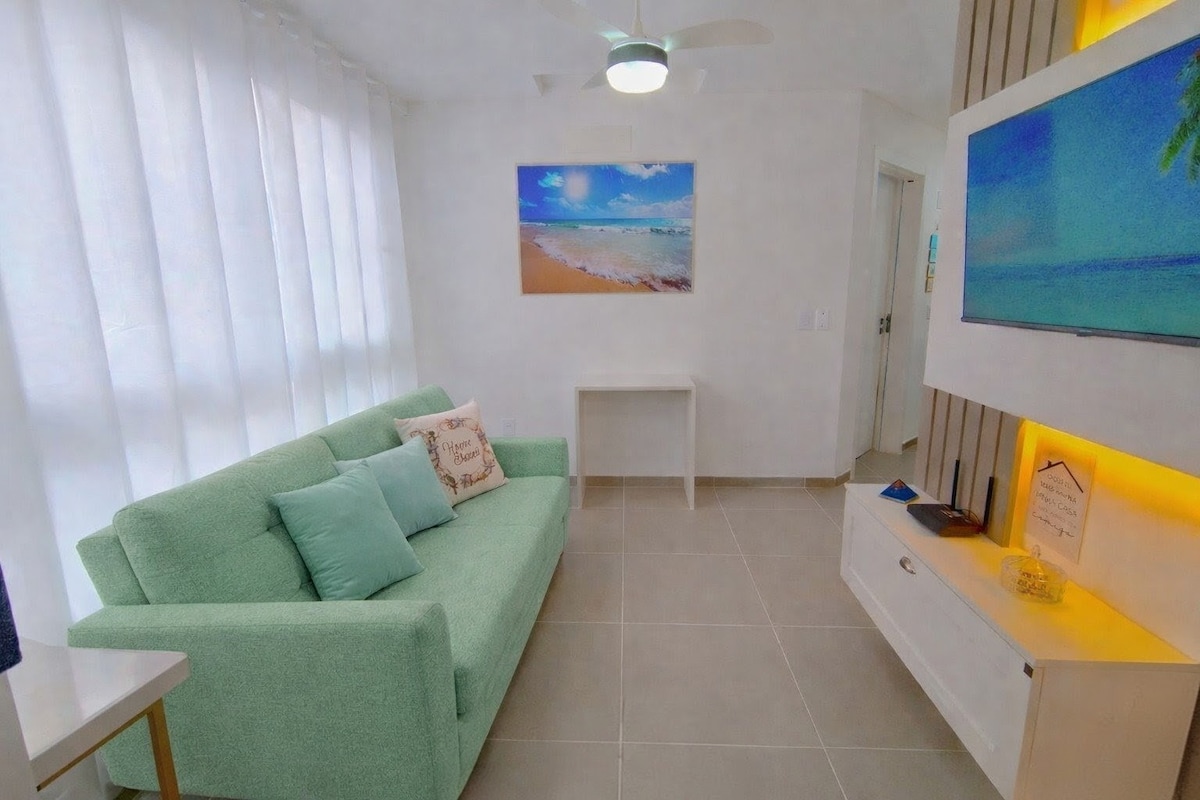 Excelente apartamento em condomínio fechado, com infraestrutura completa (piscina normal e aquecida, academia compartilhada, sauna seca e molhada, salão de beleza, brinquedoteca, campo de futebol, quadra de tênis/beach tênis). Área de lazer com churrasqueira externa e total segurança de condomínio. Apto 100% completo, todos os aparelhos eletrônicos novos, cervejeira, airfryer, cafeteira, sanduicheira , Tv. Condomínio possui ponto de apoio beira-mar com banheiro, cadeiras, chuveiro e guarda - sol