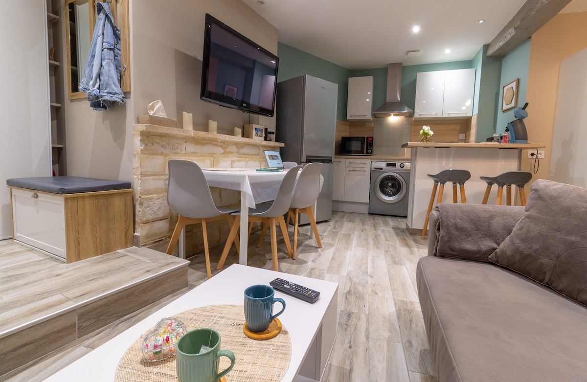 43 rue Turenne Charmant Studio tout équipé, situé au cœur du Bouchon de Champagne, Centre historique de Troyes. Facilement accessible, à 7 minutes à pieds de la gare et avec un parking public gratuit à moins de 5 minutes. Il vous permettra de visiter tout le centre historique, d'accéder aux magasins et restaurants à proximité immédiate sans avoir à utiliser de voiture. Idéalement situé. Attention accès par le 62 rue général Saussier - Netflix