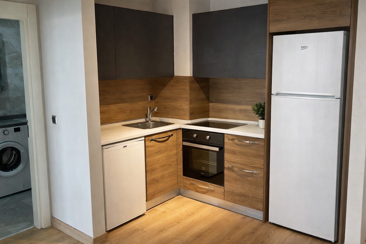 Welcome to our modern and comfortable studio apartment, designed for a relaxing stay. The space features a cozy bed, stylish living area, dining table, and a fully equipped kitchen for your convenience. The modern bathroom is clean and spacious. Enjoy fresh air on the private balcony. The apartment also includes fast Wi-Fi, air conditioning, Smart TV, and a washing machine to make your stay comfortable and enjoyable.