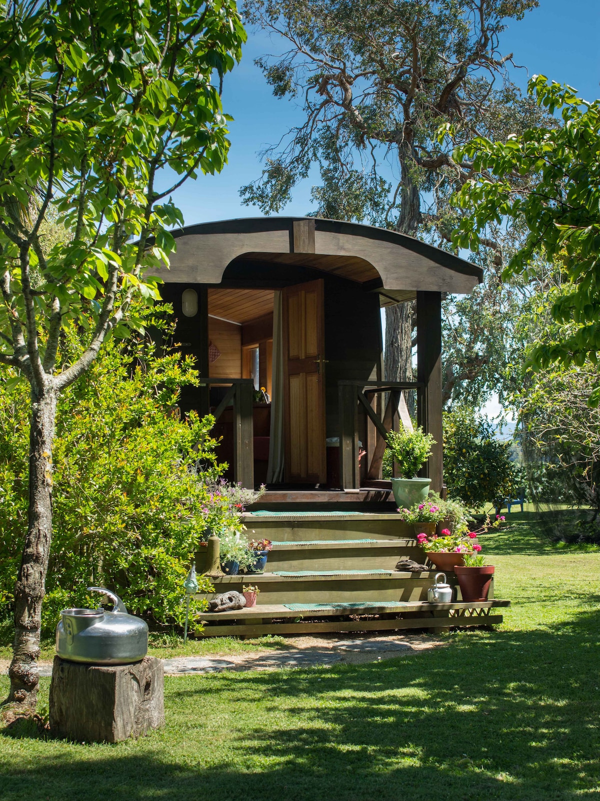 Refúgio romântico. O Caboose é uma réplica artesanal de um vagão de trem, com um pequeno jardim privativo. Situado em uma propriedade de meio acre ao lado de nossa fazenda histórica, localizada centralmente nos arredores de Motupipi, no lado leste de Golden Bay, a apenas 5 minutos de carro da praia e a 5 minutos do município de Takaka. O chuveiro ao ar livre, banheira e vaso sanitário estão todos no jardim privado que pode ser acessado com escadas do lado da varanda do Caboose. Cobertura total de telefone celular.