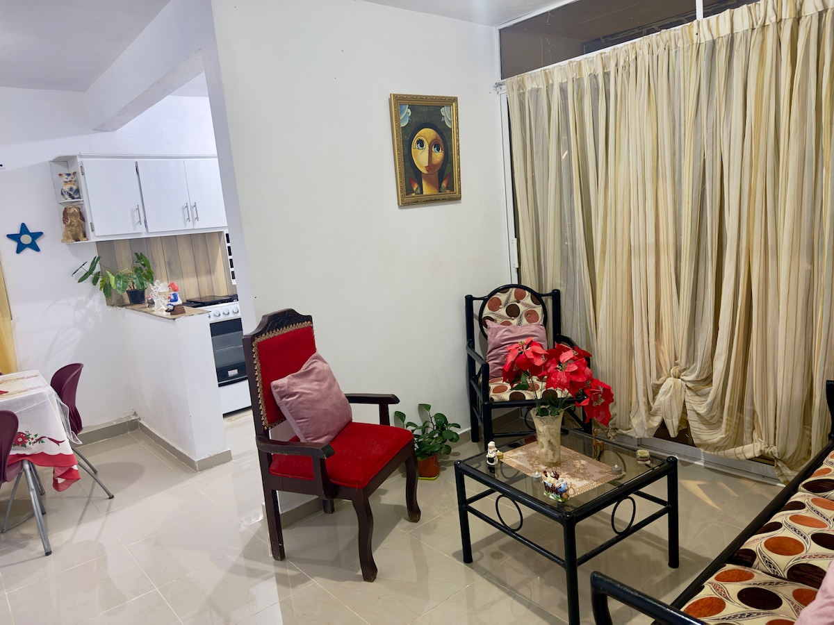 Apartamento aconchegante, localizado em um 2º. Nível, dois quartos, dois banheiros, cozinha bem equipada. Ideal para desfrutar com sua família dos lugares mais atraentes da cidade. A apenas 5 minutos a pé, você pode desfrutar do Parque, La Esquina e Antojitos de Lauren.