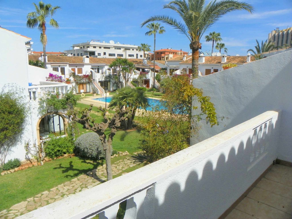 Adosado rezidencial para relaxar, desfrutar com a família, casal ou com amigos em uma comunidade muito tranquila. Há um terraço com acesso direto à piscina comum (aberta de maio a outubro, incluindo ambos). Também vista para a montanha Montgo. Este é um 6 minutos de carro da praia e 20 minutos a pé. Tem uma vaga de estacionamento aleatório incluída. Este é perto de supermercado, bares, restaurantes, farmácia, parque. Wi-Fi de fibra para teletrabalho (1.0Gb), ar condicionado em cada est