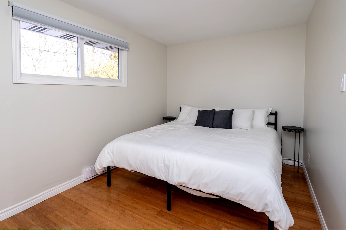 🇨🇦 Enjoy this centrally located clean boho apartment with private entrance. This is a one queen bed apartment with open floor plan. Fully equipped kitchen, full bathroom, breakfast bar, desk and dining area. You'll have everything you need for your short or long-term stay. This is located in the basement of a house. Host lives upstairs with with her dog. The apartment is completely private. Backyard access is shared.