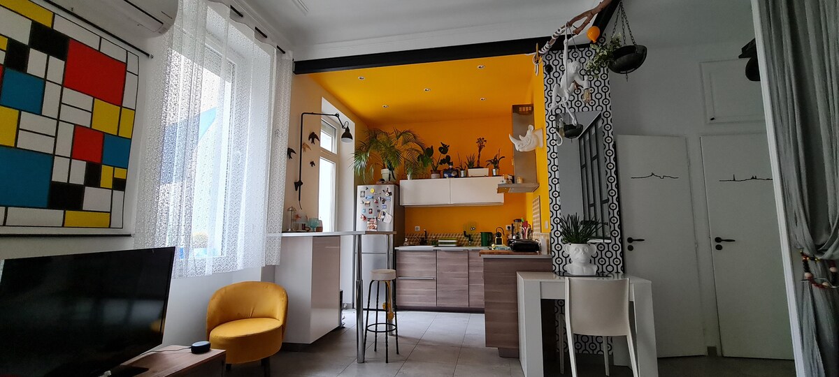 Pátio verde privativo 🌿 – Acomodação premiada do Airbnb A poucos passos de Castellane e Cours Julien, este estúdio de 37 m² com ar-condicionado é ideal para explorar Marselha andando tranquilamente. Espaçoso, 1 cama de casal + sofá-cama (acomoda 4 pessoas). Lindo pátio com toldo, perfeito para relaxar com paz e tranquilidade. Cozinha totalmente equipada, Wi-Fi, metrô, bonde, ônibus e lojas bem pertinho. ⚠️ No primeiro andar, sem acesso por elevador