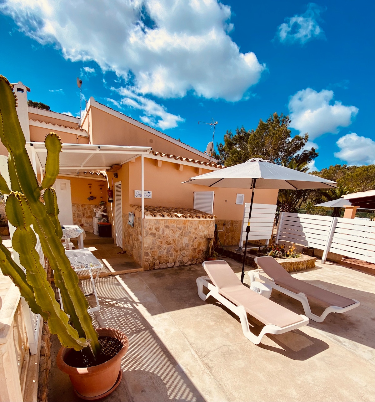 SEU PARAÍSO PARTICULAR EM IBIZA Será um prazer ter você em nossa casa e até mesmo ajudar você. Por favor, use nossa casa como um lugar para dormir, tomar banho e comer ou relaxar entre seus eventos diurnos e noturnos. Você pode ficar até 6 pessoas. A casa é dividida em três partes e elas são muito independentes conectadas apenas a partir do jardim. Na casa principal há uma espaçosa sala de estar, um quarto (cama king size). As outras partes têm um quarto cada (cama queen size) e banheiros.