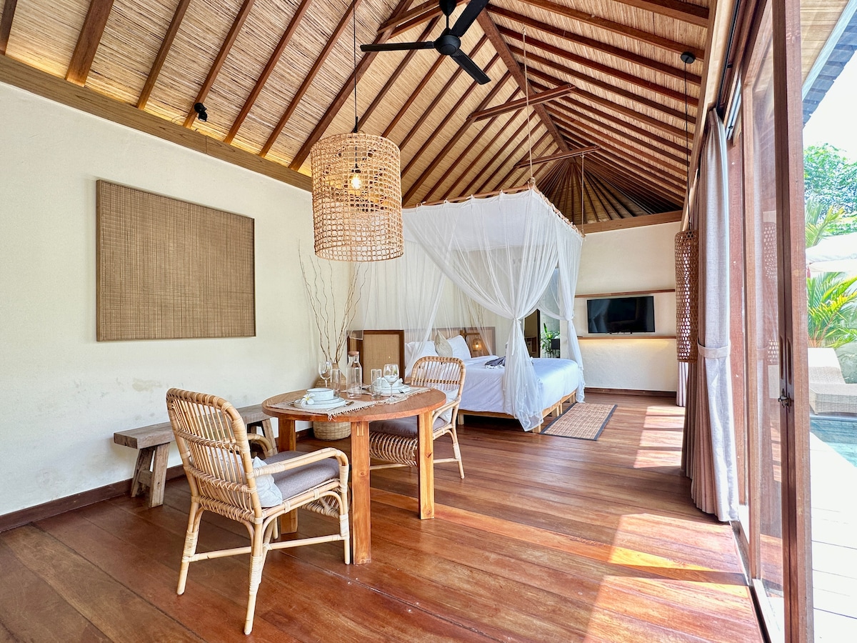 Linda vila privada tranquila de 1 quarto, terraço e 2 piscinas